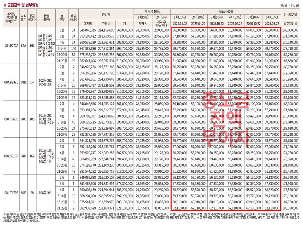 각 세대는 4개의 방과 2개의 욕실을 갖추고 있으며, 전매가 가능합니다. 계약금은 총 분양가의 10%로, 1차 5%는 자납하고 나머지 5%는 무이자 신용대출로 지원됩니다. 중도금 60%도 전액 무이자 대출이 제공되어 자금 부담을 줄일 수 있습니다.