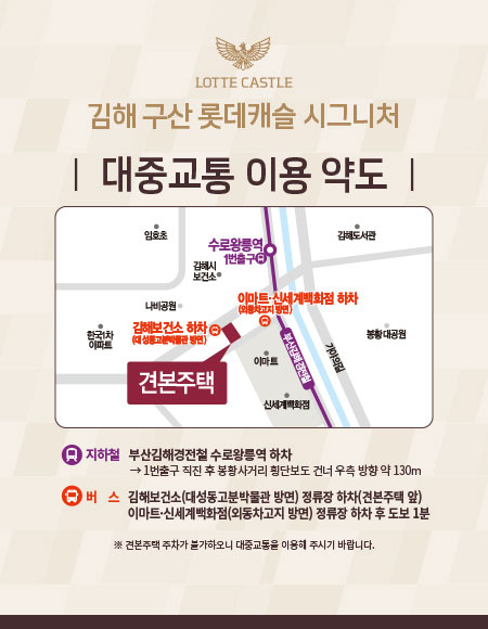 김해 구산 롯데캐슬 시그니처는 경상남도 김해시 구산동 593번지 일원에 위치해 있으며, 다양한 교통 편의성을 자랑합니다. 인근에 위치한 부산김해경전철 연지공원역을 이용하면 부산 사상구와 북구까지 30분 내에 이동이 가능하며, 부산도시철도 2호선과 3호선 환승을 통해 부산 도심까지도 빠르게 접근할 수 있습니다. 차로는 김해대로와 금관대로를 통해 창원과 부산으로 빠르게 이동할 수 있으며, 서김해IC와 동김해IC를 이용하면 남해고속도로와 중앙고속도로지선을 통해 인근 지역으로도 편리하게 이동할 수 있습니다. 김해터미널과 김해공항도 인근에 위치해 있어 전국 각지로의 이동이 용이합니다.