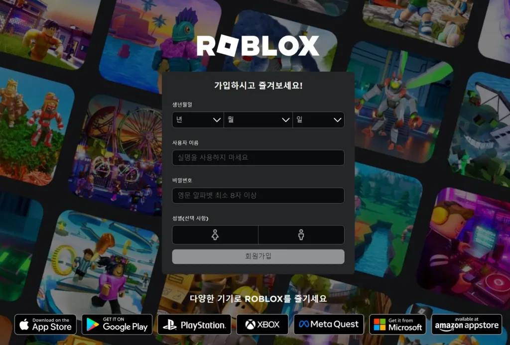 먼저, 로블록스를 이용하려면 계정을 만들어야 합니다. 이미 계정이 있으신 분들은 이 단계를 건너뛰셔도 됩니다.